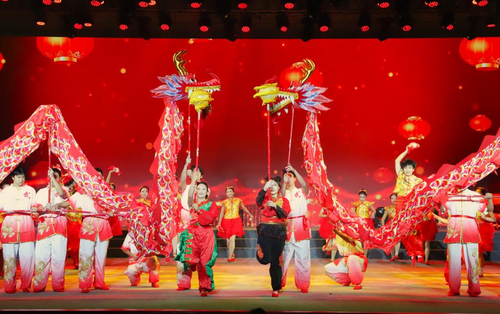 晚會在大型舞蹈《迎龍年》中拉開帷幕,舞者們身著盛裝,踏著歡快的節奏,翩翩起舞,兩條威嚴的長龍緊隨龍珠,凌空飛舞、上下翻騰,瞬間點燃了全場師生的熱情。