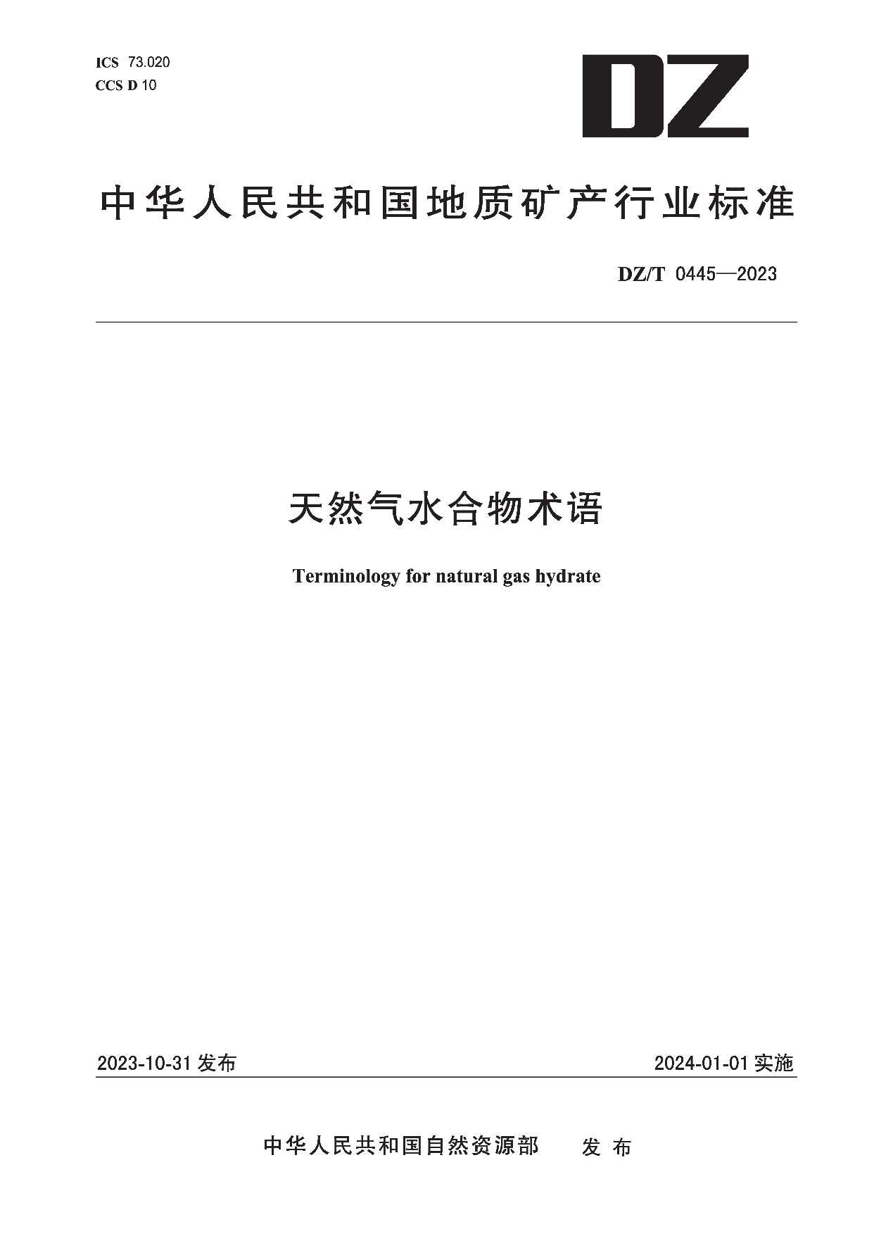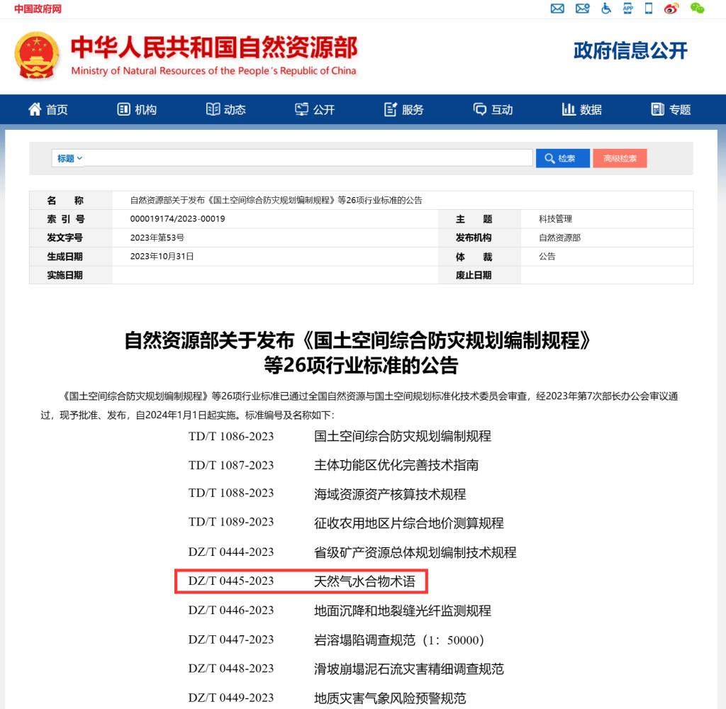 經全國自然資源與國土空間規劃標準化技術委員會審查,部長辦公會審議通過,我校參與起草的水合物資源開發類行業標準《天然氣水合物術語》(編號:DZ/T 0445-2023)自今年1月1日起正式發布實施。