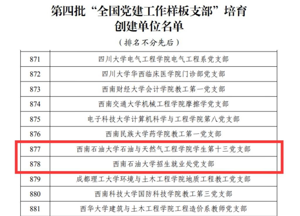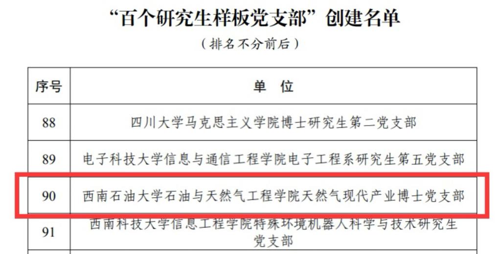 近日,教育部辦公廳發布了《關于公布第四批全國黨建工作示范高校、標桿院系、樣板支部培育創建單位名單的通知》(教思政廳函〔2024〕7 號)《關于公布第三批全國高校“百個研究生樣板黨支部”和 “百名研究生黨員標兵”創建名單的通知》(教思政廳函〔2024〕8號)。我校石油與天然氣工程學院學生第十三黨支部、招生就業處黨支部入選“全國黨建工作樣板支部”培育創建單位名單。石油與天然氣工程學院天然氣現代產業博士黨支部入選“百個研究生樣板黨支部”創建名單。