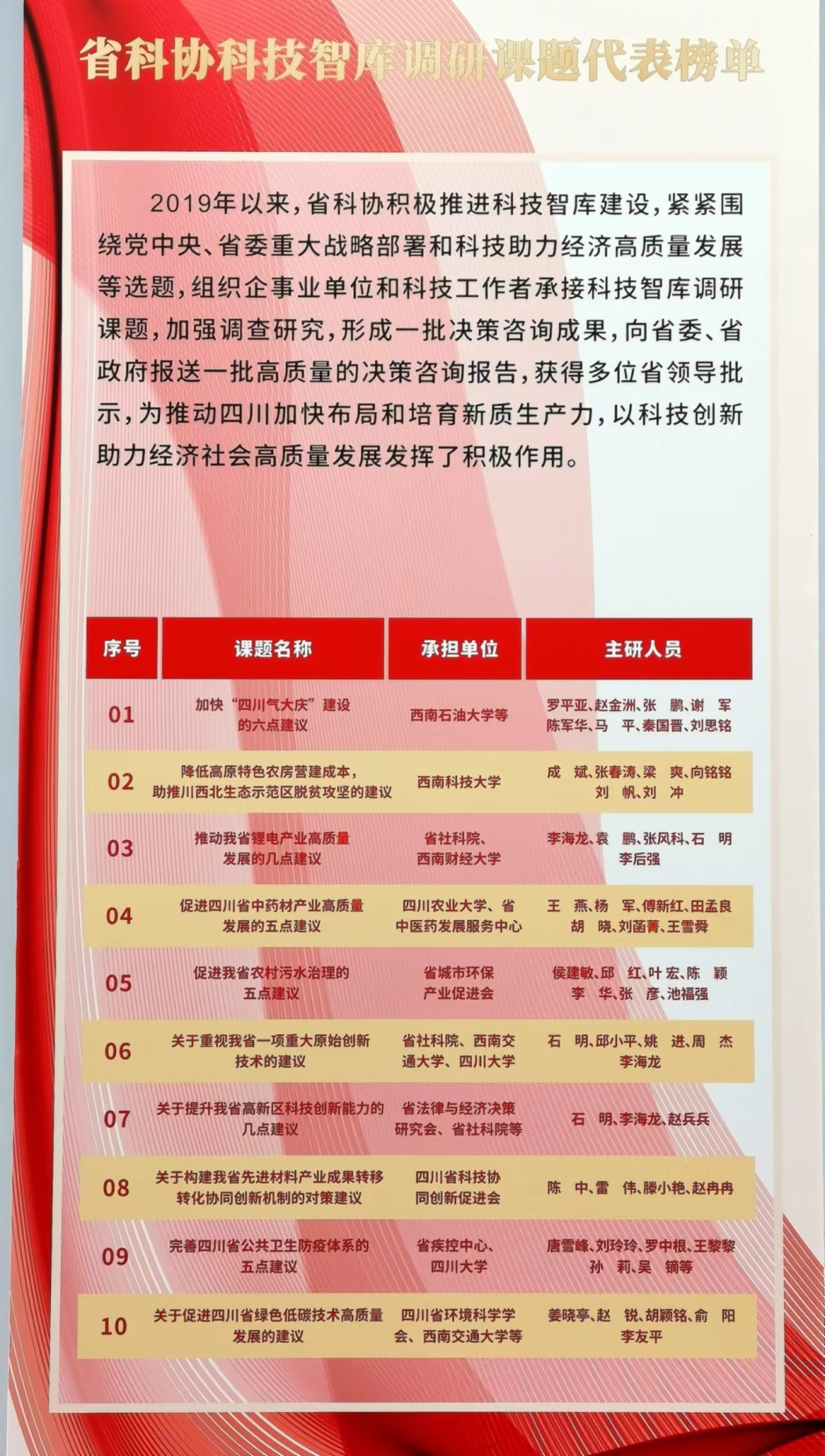 4月23日,四川省科學技術協會發布“科技智庫調研課題代表榜單”,列出了2019-2023五年間通過省科協向省委省政府報送的10項優秀決策咨詢報告,由西南石油大學牽頭報送的《加快“四川氣大慶”建設的六點建議》位列榜首。