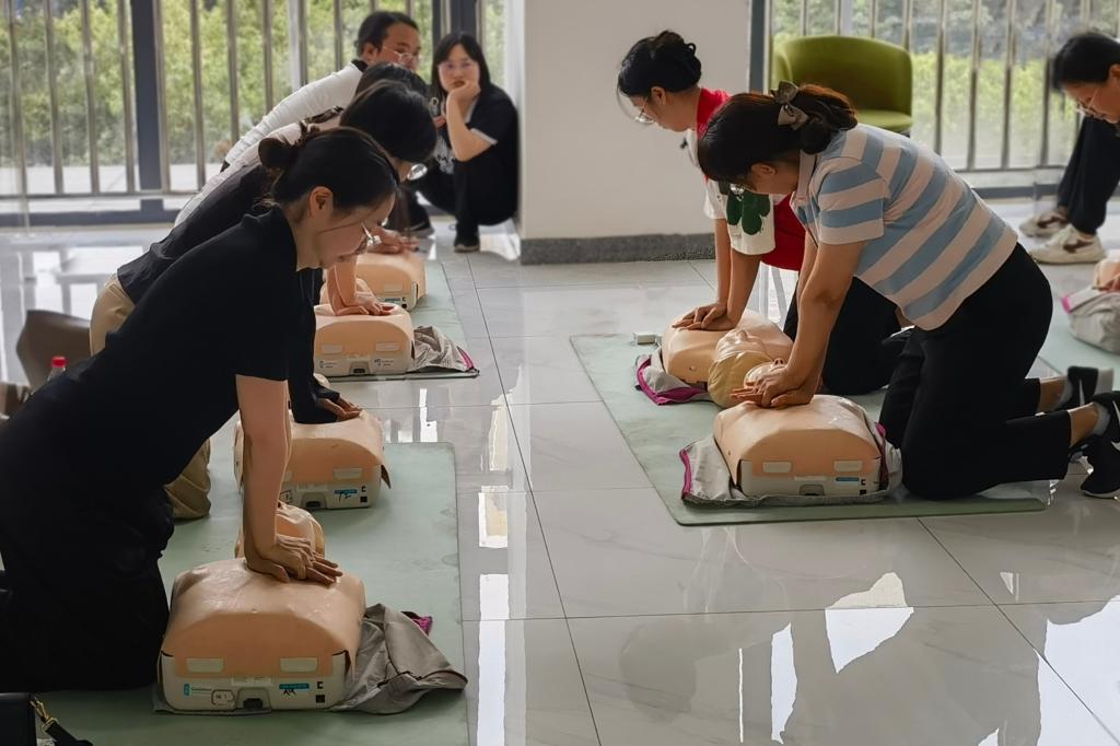當天下午,100余名教職工通過了紅十字救護員培訓,培訓內容包括心肺復蘇術、海姆立克急救法、現場創傷救護及突發事件現場應急處理等。經考核,均獲得“紅十字救護員”證書。