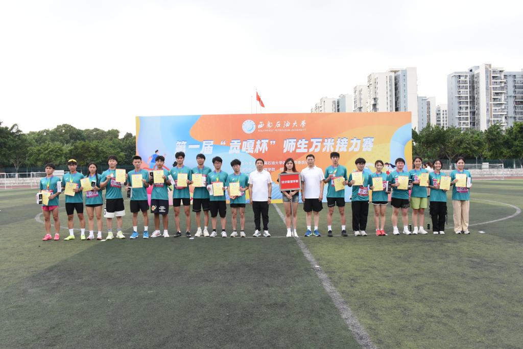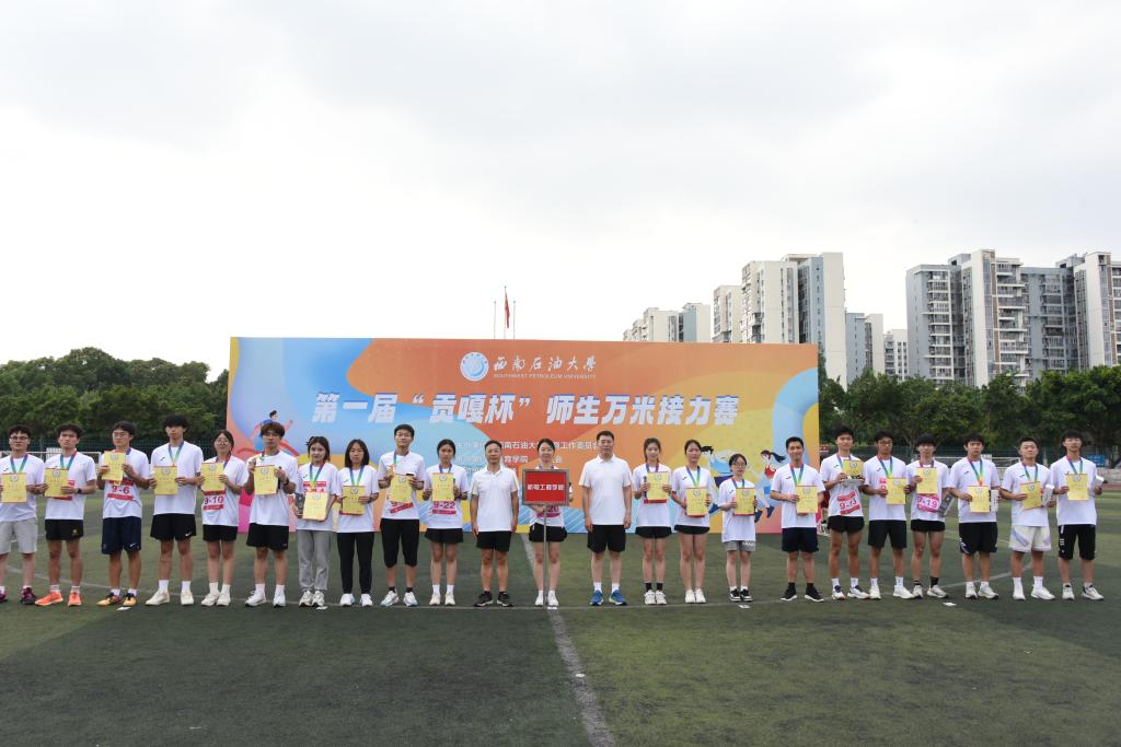 花樣跳繩和街舞暖場表演結束后,出席活動的校領導與二級學院、部分職能部門負責人組成領導方隊,率先完成第一圈400米跑,吹響大賽號角,為大賽“熱身”。隨著比賽哨聲的響起,各隊第一棒選手如離弦之箭,競相沖出起跑線,開始了這場充滿挑戰與激情的萬米跑。跑道上,師生們以昂揚的斗志,并肩作戰,奮力沖刺。看臺上,觀眾們以飽滿的激情,熱血沸騰,吶喊助威。經過激烈角逐,機電院獲得第一名(體育院總分第一,但不參與排名),經管院獲得第二名,新材院獲得第三名,石工院、計科院、地科院、法學院、電信院分別依次獲得第4-8名。校領導為獲得前三名的團隊進行了頒獎并合影。