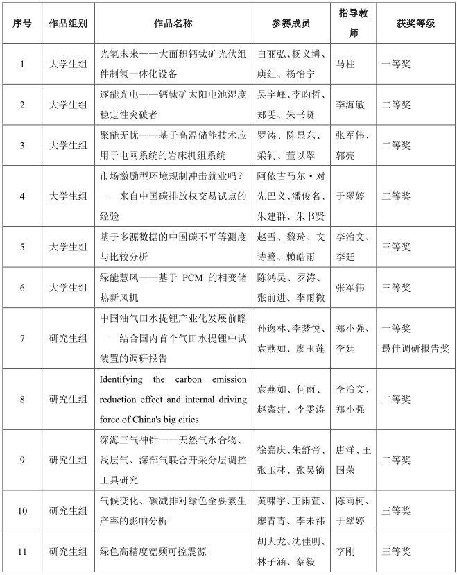 我校經濟管理學院孫逸林、李夢悅、袁燕如、廖玉蓮團隊的參賽作品《中國油氣田水提鋰產業化發展前瞻——結合國內首個氣田水提鋰中試裝置的調研報告》獲研究生組一等獎和大賽唯一的“最佳調研報告獎”;新能源與材料學院白麗弘、楊義博、庾紅、楊怡寧團隊的參賽作品《光氫未來——大面積鈣鈦礦光伏組件制氫一體化設備》獲大學生組一等獎;鄭小強、李廷、馬柱榮獲優秀指導教師獎,我校榮獲優秀組織單位獎,郭志鋼榮獲“大賽組織貢獻獎”。