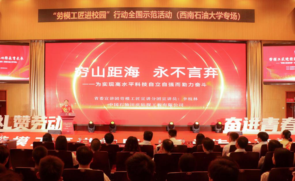 “窮山距海、永不言棄,勠力同心、精益求精!”中國石油天然氣集團(tuán)川慶鉆探工程有限公司科技信息部副總經(jīng)理、四川省勞動(dòng)模范李枝林以《窮山距海永不言棄——為實(shí)現(xiàn)高水平自立自強(qiáng)而勠力奮斗》為主題,結(jié)合自身探索科研的經(jīng)歷,為師生們帶來了一場(chǎng)振奮人心的思政課堂。