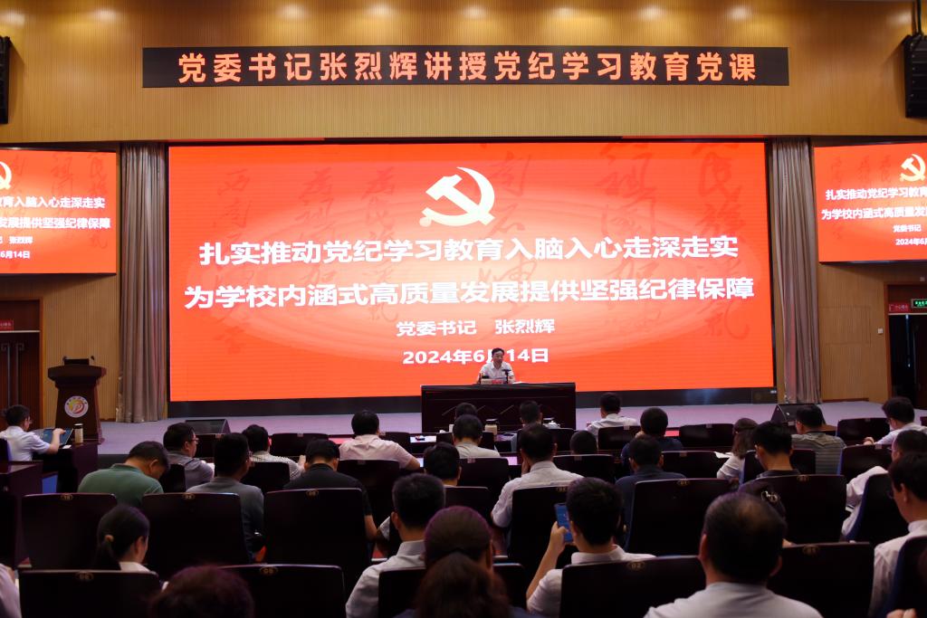 張烈輝以“扎實(shí)推動(dòng)黨紀(jì)學(xué)習(xí)教育入腦入心走深走實(shí) 為學(xué)校內(nèi)涵式高質(zhì)量發(fā)展提供堅(jiān)強(qiáng)紀(jì)律保障”為題,從“站在政治和全局的高度,深刻認(rèn)識(shí)開展黨紀(jì)學(xué)習(xí)教育的極端重要性、深入學(xué)習(xí)貫徹《中國共產(chǎn)黨紀(jì)律處分條例》,教育引導(dǎo)廣大黨員干部堅(jiān)決做到‘兩個(gè)維護(hù)’、緊盯苗頭性傾向性問題,抓早抓小防治由風(fēng)及腐、嚴(yán)格遵守黨的六項(xiàng)紀(jì)律,切實(shí)提升黨員干部四個(gè)定力”四個(gè)方面分析講解了推進(jìn)黨紀(jì)學(xué)習(xí)教育進(jìn)一步走深走實(shí)的重要意義和具體措施。