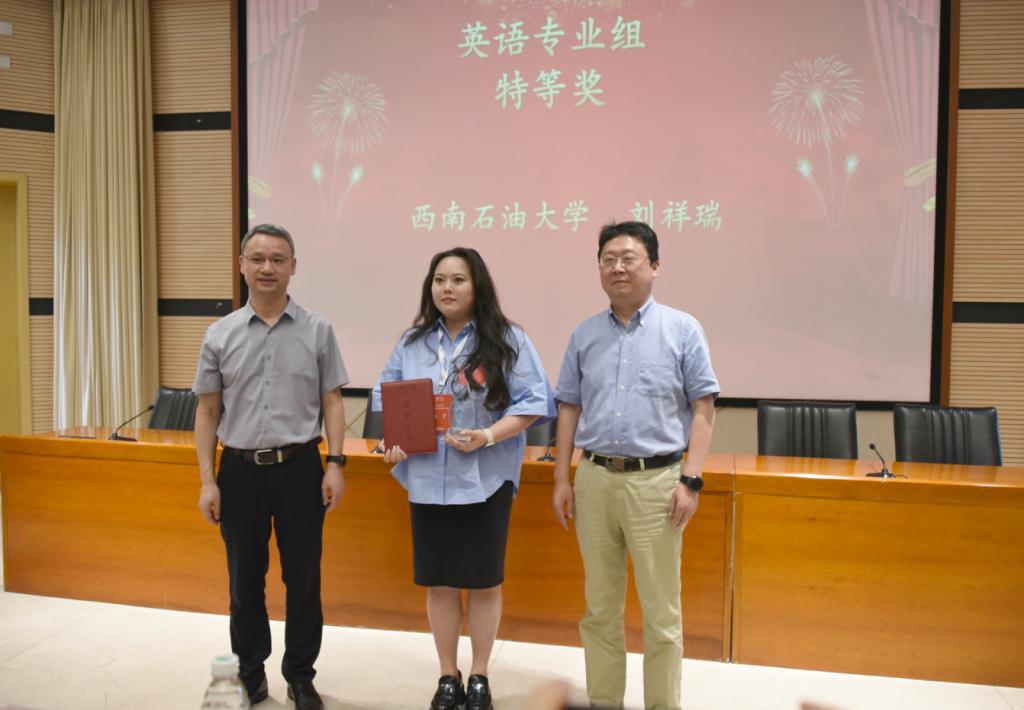 四川高校外國語言文學(xué)類專業(yè)教指委主任委員、四川大學(xué)段峰教授,上海外語教育出版社副總編張宏,西南石油大學(xué)黨委常委、組織部部長易聯(lián)樹,西南石油大學(xué)教務(wù)處處長廖柯熹等為獲獎選手頒獎。