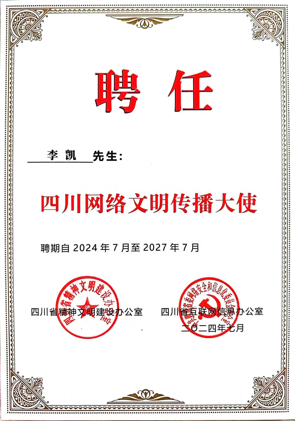 7月26日,“e路川行·文明有我”2024年四川省網絡文明主題實踐活動啟動儀式在新都區新時代文明實踐中心舉行?;顒蝇F場舉行了四川網絡文明傳播大使聘任儀式,全國道德模范提名獎、中國青年五四獎章獲得者、我校教師李凱受聘出任四川網絡文明傳播大使。全省共20人受聘。