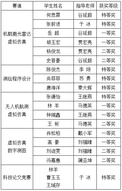今年設(shè)八個(gè)賽道,我校參加了機(jī)載激光雷達(dá)虛擬仿真、測(cè)繪程序設(shè)計(jì)、無人機(jī)航測(cè)虛擬仿真、虛擬仿真數(shù)字測(cè)圖、科技論文五個(gè)賽道。各賽道參賽隊(duì)從700余個(gè)至1700余個(gè)不等,科技論文參評(píng)數(shù)量426篇。按照參賽基數(shù)的5%、10%、15%分設(shè)特等獎(jiǎng)、一等獎(jiǎng)和二等獎(jiǎng)。