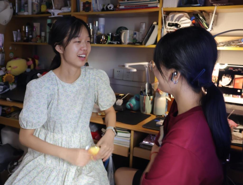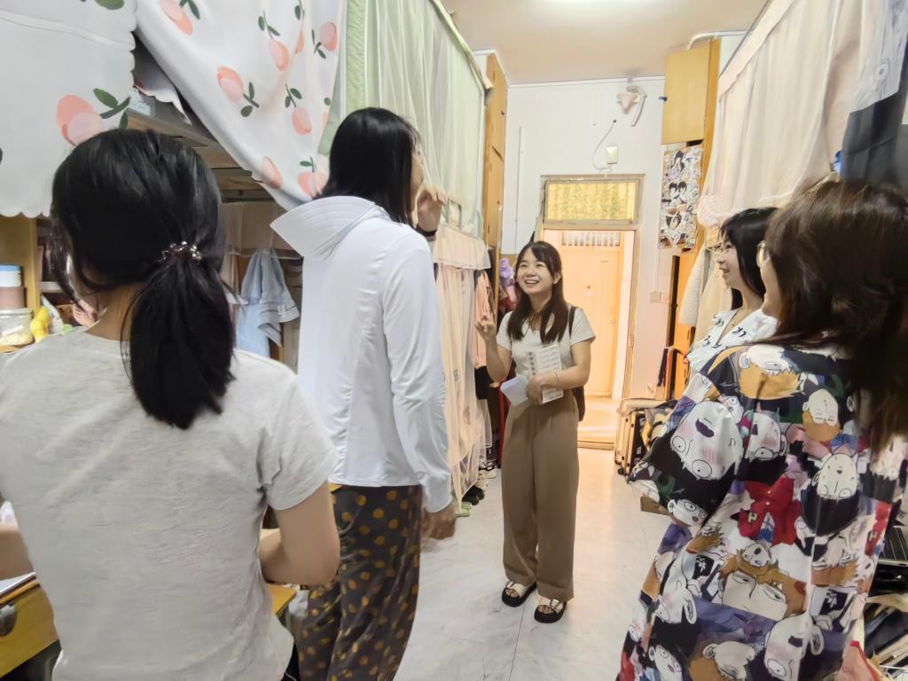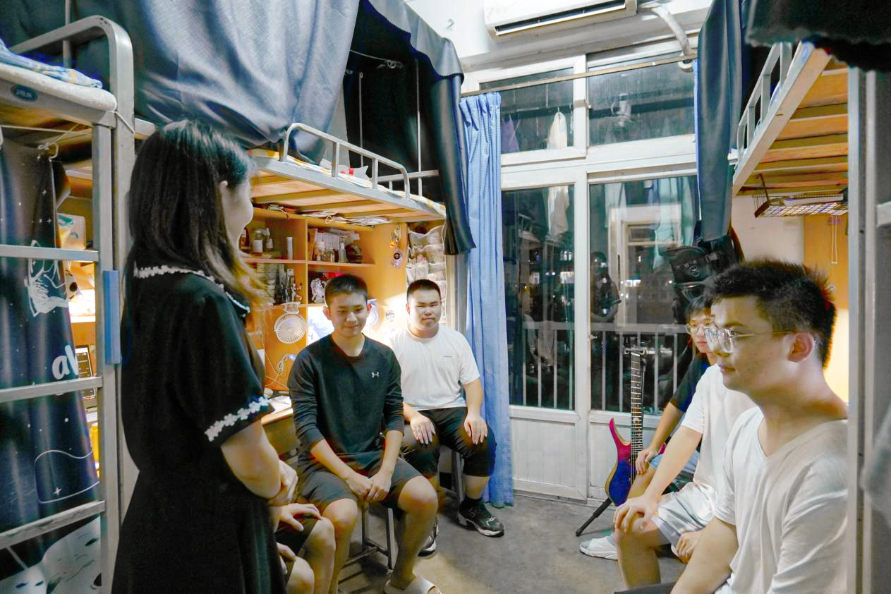 學生宿舍內,輔導員楊媚正在檢查學生宿舍,輔導員程美容為同學們送上藿香正氣液。楊媚鼓勵同學們,“大家要以積極的心態迎接充滿無限可能的新學期,經營好自己的學習和生活。”程美容囑咐道:“最近氣溫攀升,大家要注意防暑哦!”