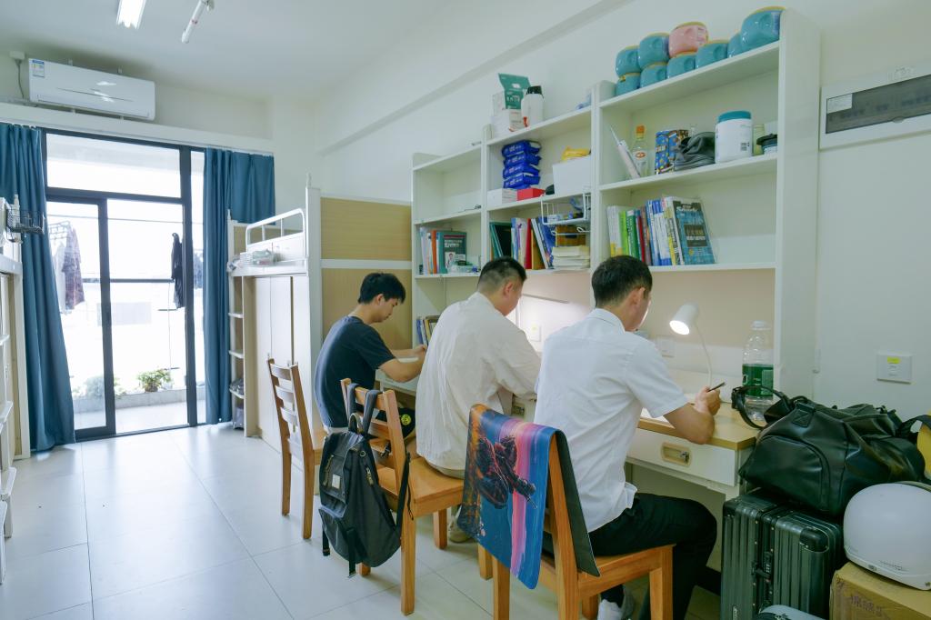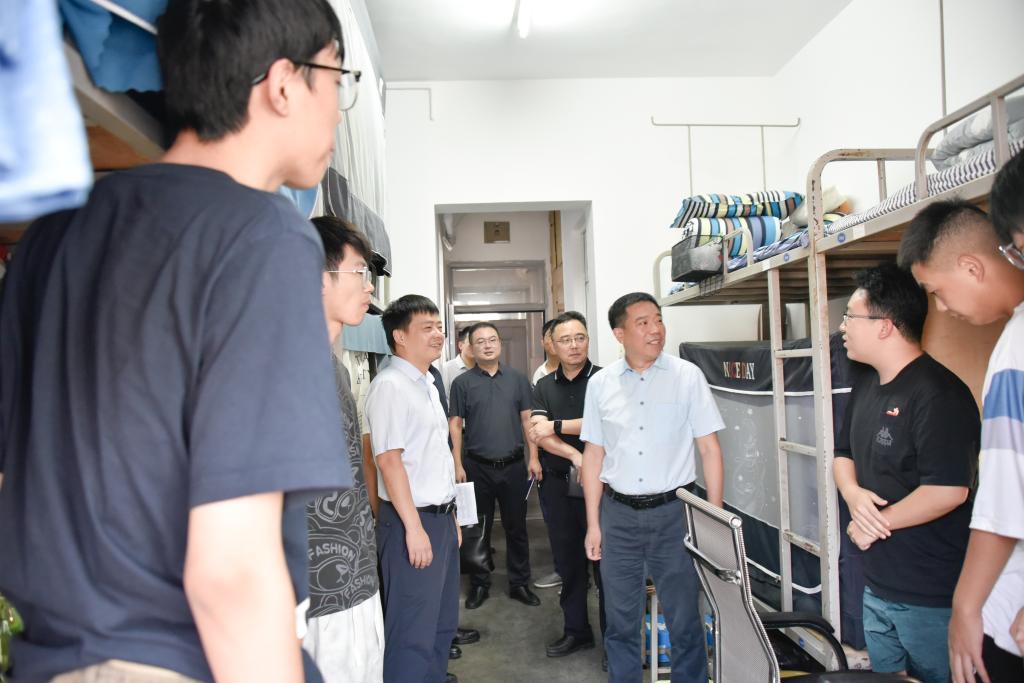 學生宿舍內,同學們正在做課前準備。郭建春走進寢室,與同學們親切交流。“新學期第一堂課,我看你們干勁很足啊!高溫天氣肆虐,這一周是最艱難的,咱們堅持克服下!”