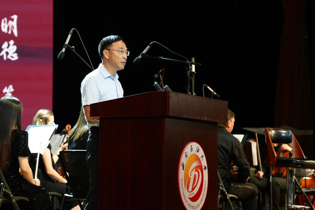 張烈輝對四川文化藝術學院國際交響樂團來校演出表示感謝。他指出,近年來,學校高度重視校園文化建設和美育工作,通過“藝術+思政”形式,深入推進“愛+”美育思政課建設,精心打造出了一系列“愛+”美育思政課視聽作品,引導學生涵養“家國情懷”,堅定理想信念。舉辦大學生“飛翔”藝術節、搭建“夢溪藝苑”等美育工作載體,為青年學子施展才華、彰顯個性、綻放夢想提供了的舞臺,讓同學們在濃厚的校園藝術美育文化氛圍中,發現美、享受美、創造美,不斷提升學生的精神文化追求、人文素養和藝術審美體驗。他希望同學們,提升審美素養,涵育人文情懷,培養創新精神,讓藝術之光照亮奮進青春的追夢道路,讓科學精神與藝術情懷在西南石大校園綻放出更加絢麗的青春光彩。