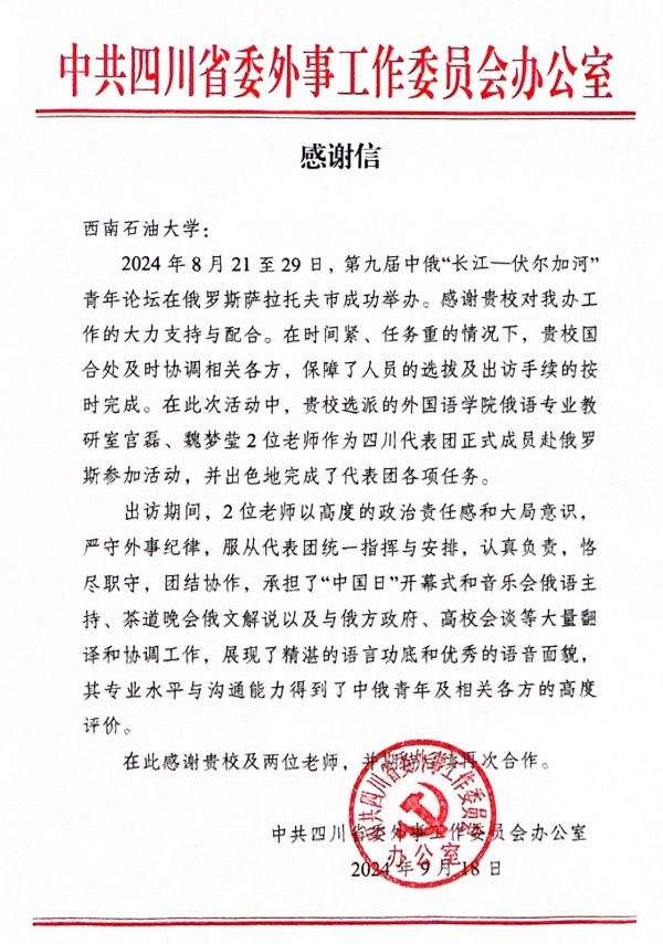 感謝信說,感謝貴校對我辦工作的大力支持與配合。在時間緊、任務重的情況下,貴校國合處及時協調相關各方,保障了人員的選拔及出訪手續的按時完成。在此次活動中,貴校選派的外國語學院俄語專業教研室宮磊、魏夢瑩2位老師作為四川代表團正式成員赴俄羅斯參加活動,并出色地完成了代表團各項任務。