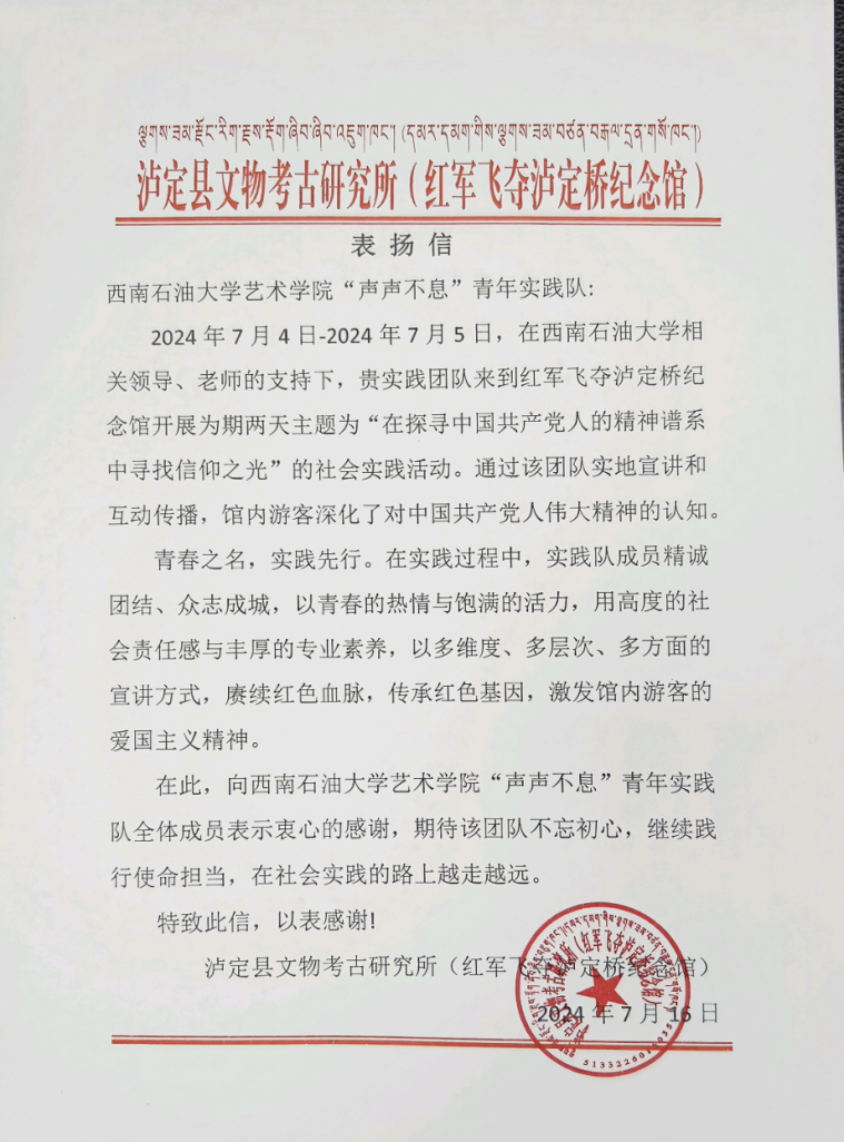 紅軍飛奪瀘定橋紀念館發(fā)來的表揚信