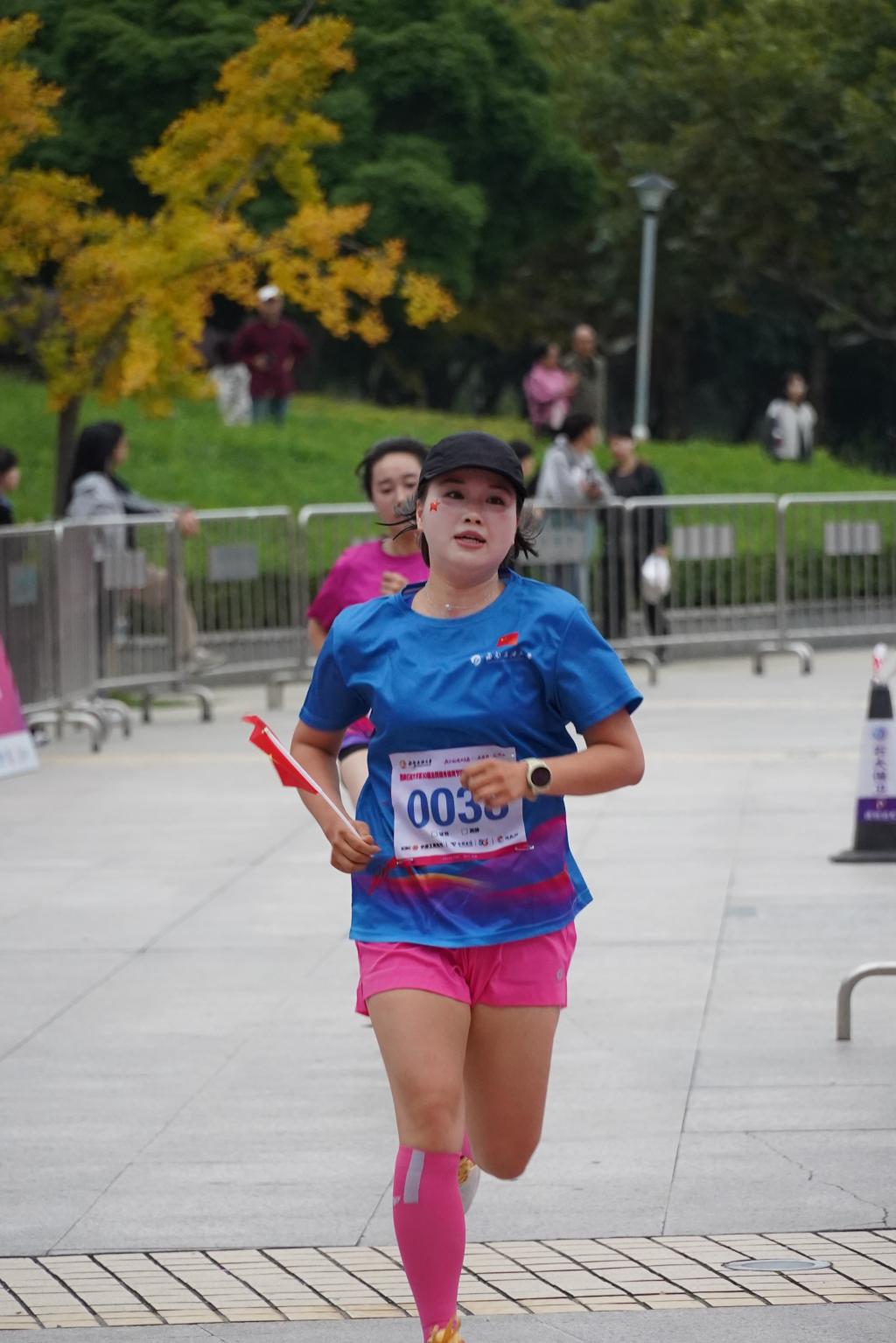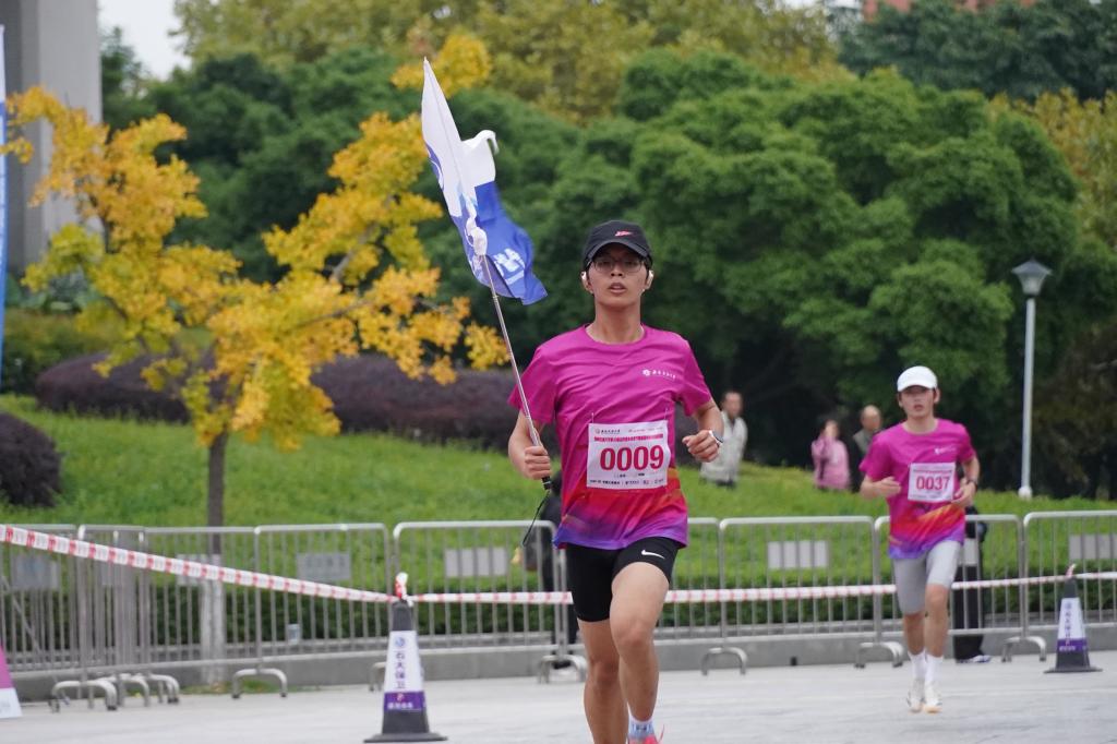 參賽師生校友青春洋溢,一路揮灑汗水,不斷挑戰(zhàn)自我。一呼一吸,一步一腳印,參賽者共同享受奔跑與風景交融的盛宴?!疤衾?!再堅持下!”路邊觀眾和啦啦隊員為參賽選手吶喊助威,志愿者為參賽者保駕護航,不少學生受氣氛感染也加入到馬拉松的隊列。