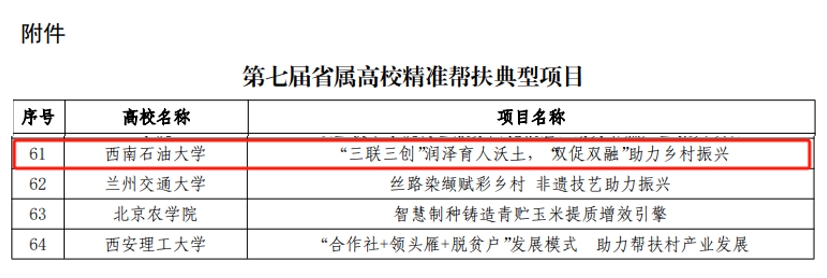 近日,教育部公布了第七屆省屬高校精準幫扶典型項目的評選結果,我校報送的《“三聯三創”潤澤育人沃土,“雙促雙融”助力鄉村振興》入選。這是我校第6次入選全國精準幫扶典型項目。