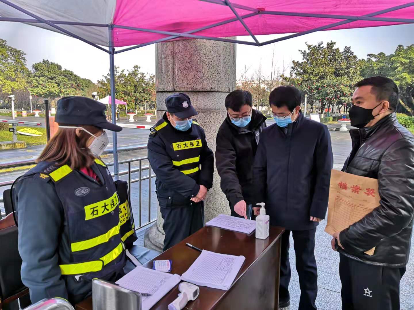 校黨委副書記趙正文來到南大門保安崗亭,看望保衛處執勤人員。趙正文對保衛處在第一時間升級門禁管理、加強校內巡邏等工作給予了充分肯定,勉勵他們在疫情防控中做出更大的貢獻。