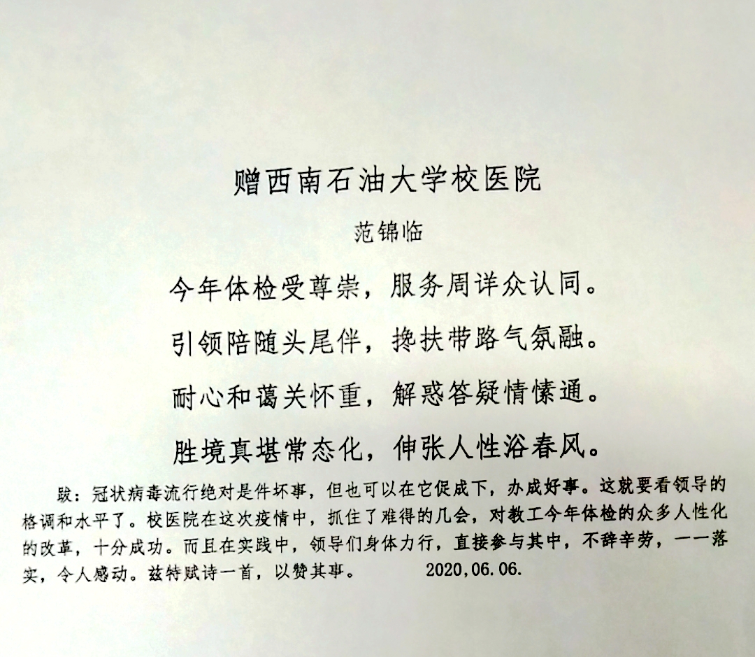 離休干部范錦臨老人在體檢結束后,特賦詩一首,表達了對校醫(yī)院工作的感謝。