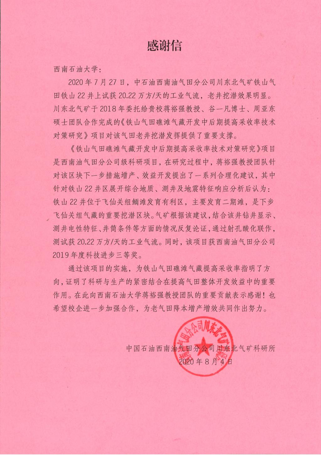 感謝信說,該項目的實施為鐵山氣田礁灘氣藏提高采收率指明了方向,證明了科研與生產結合在提高氣田整體開發效益中的重要作用,向西南石油大學蔣裕強教授團隊的重要貢獻表示感謝,希望校企進一步加強合作,為老氣田降本增產增效共同作出努力。
