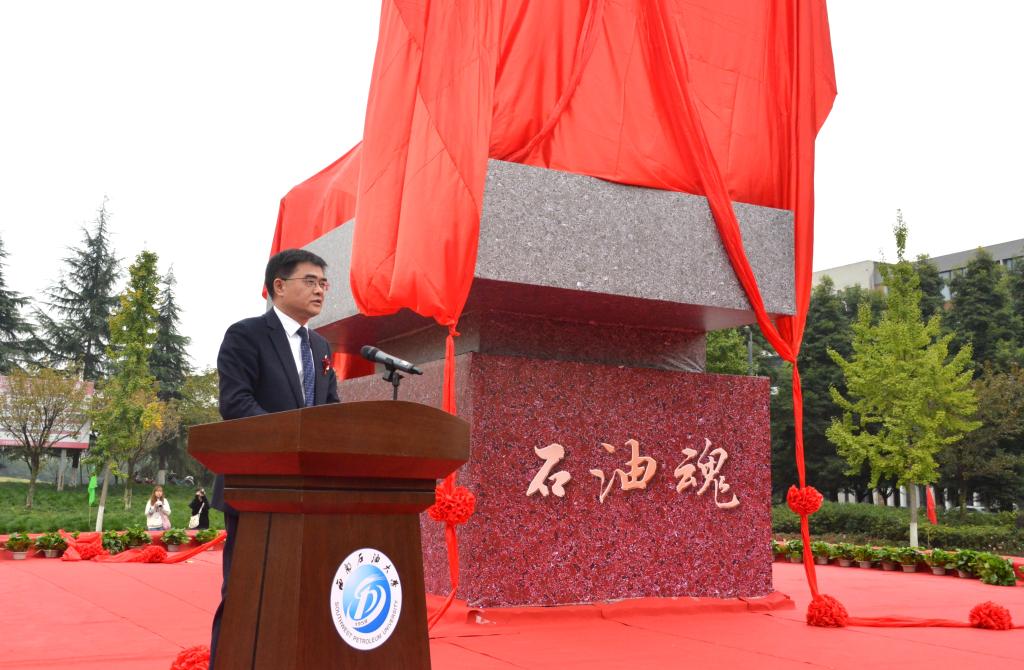 趙正文在揭幕儀式上講話,趙金洲宣布“石油魂”雕塑落成,校領導、校友代表、師生代表共同為雕塑揭幕。