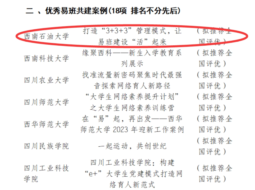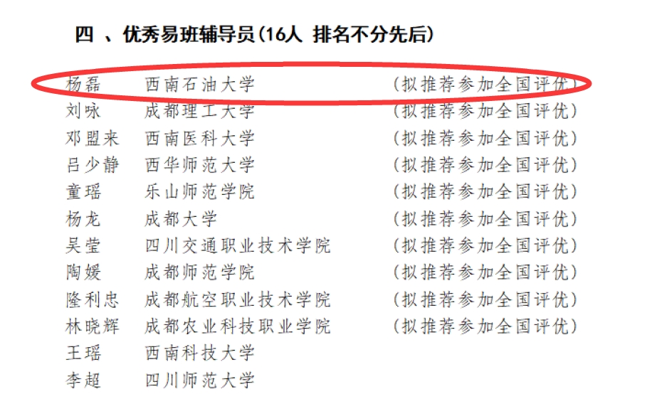 我校連續(xù)七次榮獲四川省“優(yōu)秀易班共建高校”;電氣信息學(xué)院輔導(dǎo)員李星昱撰寫的工作案例《打造“3+3+3”管理模式,讓易班建設(shè)“活”起來》榮獲四川省“優(yōu)秀易班共建案例”;黨委學(xué)生工作部(處)副部(處)長陳俐宏榮獲四川省“優(yōu)秀易班指導(dǎo)教師”;化學(xué)化工學(xué)院輔導(dǎo)員楊磊榮獲四川省“優(yōu)秀易班輔導(dǎo)員”;學(xué)校易班工作站站長、新能源材料與器件2021級學(xué)生趙媛獲評四川省“優(yōu)秀易班工作站站長”。