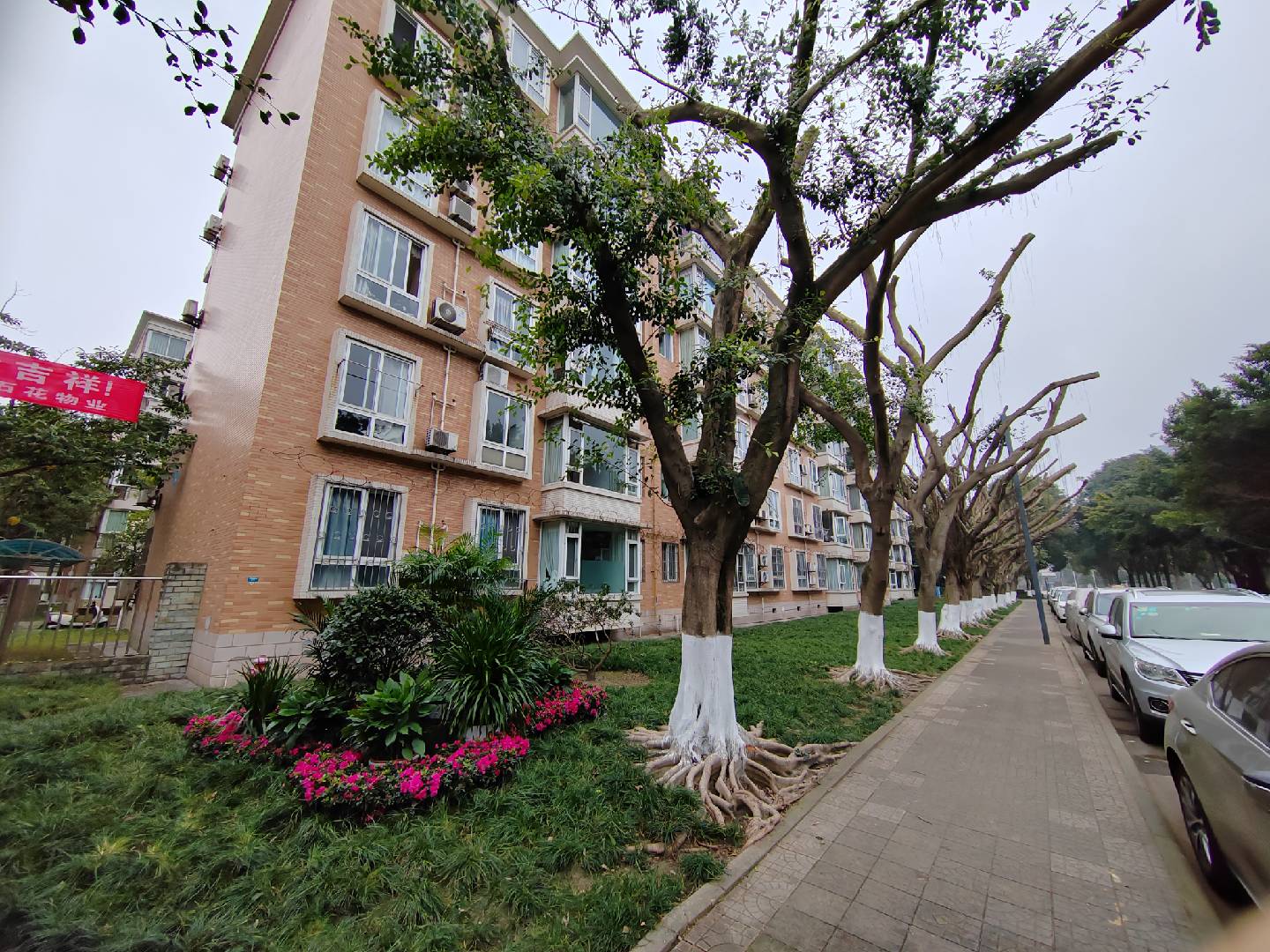 龍井苑小區3棟南側有一排小葉榕,樹齡已逾20年,樹干粗壯,枝葉繁茂,嚴重影響了低層的采光和通風。接到教職工訴求后,后勤部迅速組織綠化專家到現場踏勘,調研了新都區、兄弟高校的做法,同時組織相關部門、教師代表座談,決定用“短截法”鋸掉樹冠,保留主干,既保障住戶的采光權,又可讓樹木長出新枝葉。另外,為增加層次感,還增設了盆栽植物進行點綴美化。