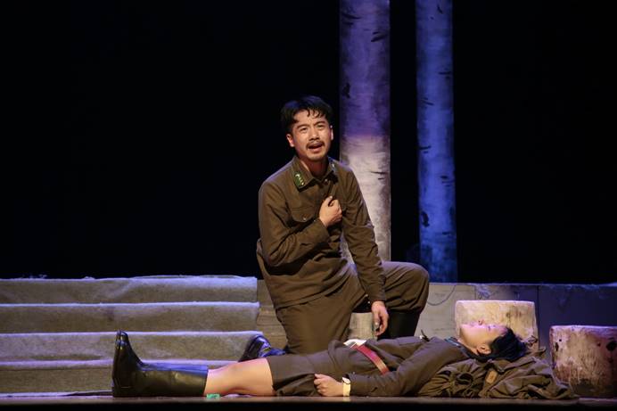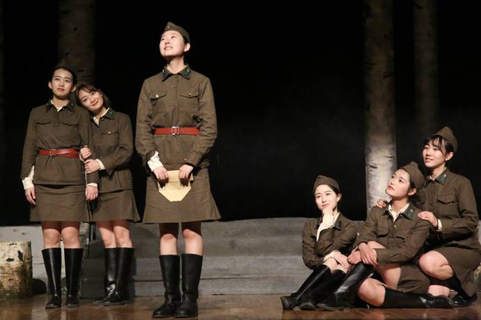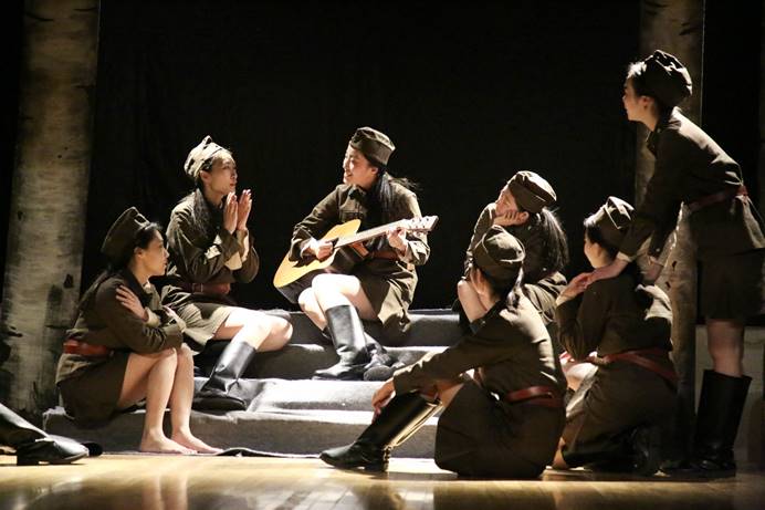 整場表演的故事情節跌宕起伏,扣人心弦。戰爭的殘酷和女兵對和平幸福的向往通過演員細膩的演繹,給觀眾造成了強烈的心靈沖擊,達到了主題的升華。舞臺布景以西伯利亞的廣袤森林為基調,經過燈光的輔助,渲染出濃郁的異國風情。經過開場輕快幽默的短暫鋪陳,隨即進入話劇的關鍵部分——德國兵潛入了森林,瓦斯科夫率領五位女兵前往阻擊。隨后,高潮部分的戰斗過程緊張刺激,舞臺上演員們的一顰一笑都緊緊牽動著臺下觀眾的心。讓人最為印象深刻的是導演著重刻畫的女兵犧牲過程,天真活潑的女兵在中彈倒下時,舞臺上燈光突然轉換,即將犧牲的女兵仿佛回到她過去的幸福生活中,與愛人甜蜜相戀,與朋友歡樂相伴,與家人親情不斷。這種強烈的反差對比產生了震懾人心的力量,讓許多觀眾不禁流淚。演員們在舞臺上用極具張力的表演,塑造了一個又一個鮮活生動的人物形象,將觀眾帶入到故事中去,從而引發人們對侵略戰爭的思考和對人性的多元理解。