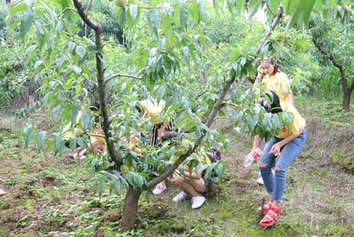 這天西南石油大學藝術學院水果羅曼史實踐隊如往常一樣來到了重慶市百勝鎮,準備開始今天的果園勞作,今天阿姨要帶我們去果園里的桃子林進行勞作。走過長長的一段田坎,我們終于來到了茂密的桃子林。