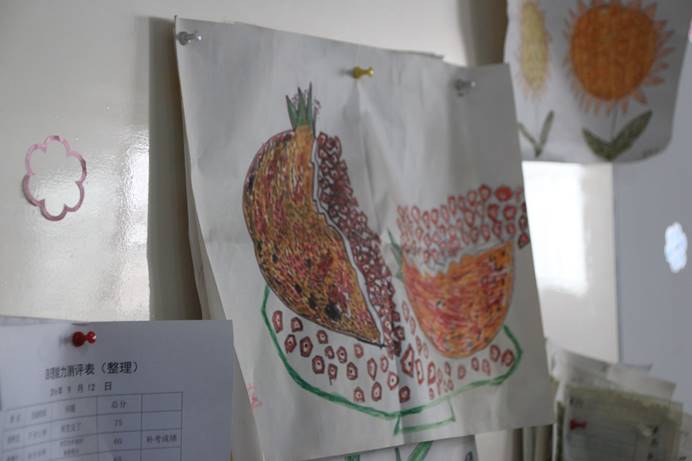 七月,成都,透藍(lán)的天空,懸著火球似的太陽(yáng)。一大早西南石油藝術(shù)學(xué)院藝之行陽(yáng)光公益暑期實(shí)踐隊(duì)驅(qū)車趕往青羊區(qū)殘疾人托養(yǎng)中心,推開(kāi)門,作品展示墻映入眼簾。他們還在另一邊上著美術(shù)課,我們不敢打擾,在一邊靜靜欣賞他們的創(chuàng)作。