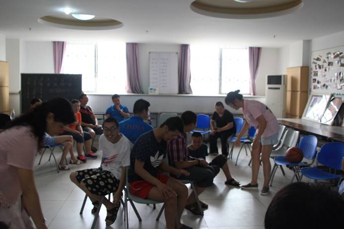 對(duì)他們來(lái)說(shuō)我們并不陌生,幾天的相處下來(lái)一個(gè)微笑一個(gè)眼神大家之間都能很好的交流。又到了游戲時(shí)間,今天玩了一個(gè)搶凳子的游戲。在激動(dòng)興奮的音樂(lè)中,他們謹(jǐn)慎而又開(kāi)心的圍著凳子繞圈圈。還有同學(xué)因?yàn)榧ち业膿尩首铀ち讼聛?lái),雖然屁股很疼,被淘汰了,但是他說(shuō)他依然很開(kāi)心,重要的是參與的樂(lè)趣。