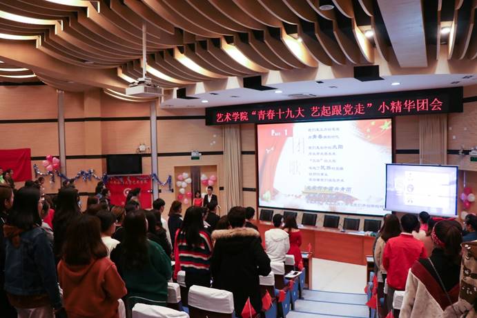 十九大剛剛過去不久,認真學習黨的十九大精神,是我們首要的政治任務。為使十九大精神深入到同學們的學習生活中,藝術學院于2017年11月16日晚在思學樓A114召開“青春十九大藝起跟黨走”小精華團會。蒞臨本次團會的有校團委蒲彥羽老師、藝術院團總支書記何姍老師以及外院的評審團們,同時2017級全體同學參與了此次團會。