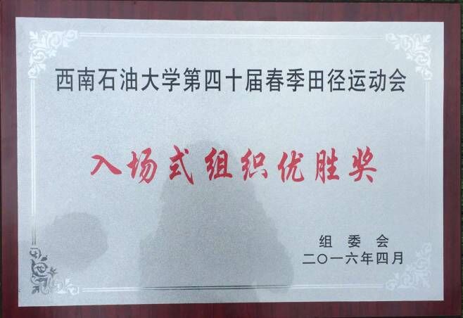 陰沉兩日的天氣終于在運動會的尾程露出陽光的笑臉,追逐著運動健兒的身影,兩天的賽程也在這鑼鼓喧天的熱鬧氣氛中拉下了帷幕。2016年4月9日下午4:00,歷時兩天的西南石油大學第四十屆春季田徑運動會在一期田徑場落下帷幕,我院榮獲本屆運動會“入場式組織優勝獎”。