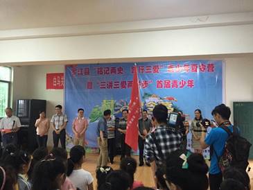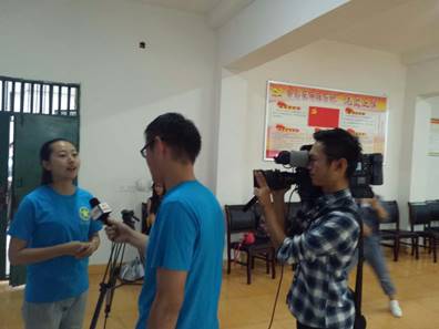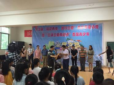 由于天氣原因,原本戶外的活動改成在會議室里進行。活動開始前,三名實踐隊員有序地帶領幾個孩子打掃會議室衛(wèi)生。活動中,實踐隊作為夏令營禮儀代表,協(xié)助相關領導頒獎授牌給學校;另外又作為夏令營孩子代表負責舉活動旗。活動最后,楊潔同學代表實踐隊接受了羅江地方電視臺的相關采訪。