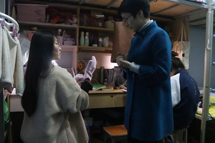本次寢室走訪主要是檢查寢室衛(wèi)生,何姍、竇雪鋒、孫曉光三位老師分別對17級、16級、15級三個年級的寢室進(jìn)行了走訪。何姍老師對部分東西較多且還沒有整理好的寢室,提出了批評,并指導(dǎo)她們整理寢室,督促她們要保持寢室衛(wèi)生。同時,對整潔干凈的寢室,何姍老師也提出了表揚(yáng)。竇雪鋒老師除了查看各寢室衛(wèi)生及寢室布局情況外,還對歸寢時間進(jìn)行嚴(yán)格要求,囑咐大家晚上要按時歸寢,嚴(yán)格外出請假手續(xù)。在15級寢室走訪過程中,孫曉光老師在衛(wèi)生檢查的基礎(chǔ)上,還關(guān)心了同學(xué)們的學(xué)習(xí)情況,督促大家要進(jìn)入大三下學(xué)期要對自己的學(xué)業(yè)有一個明確的規(guī)劃。在寢室走訪過程中,老師們不僅關(guān)心著同學(xué)們的日常生活,對一些同學(xué)不良的生活習(xí)慣提出了建議。三位老師希望同學(xué)們的寢室生活能更加干凈整潔,多姿多彩。