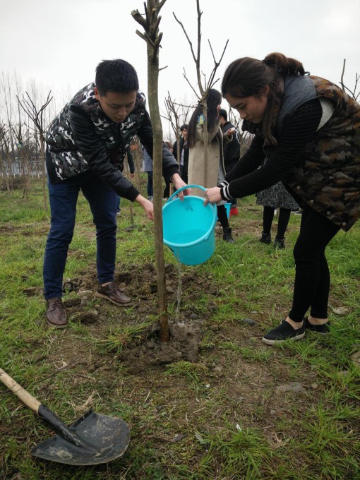 這次的植樹活動在明德樓后面的“學子感恩林”進行。同學們拿著水桶、鐵鍬、鏟子,分工明確的進行著各自的任務(wù),既考慮細節(jié)又注重效率。活動期間,同學們都積極參與,認真投入,每道工序都進行的井然有序。