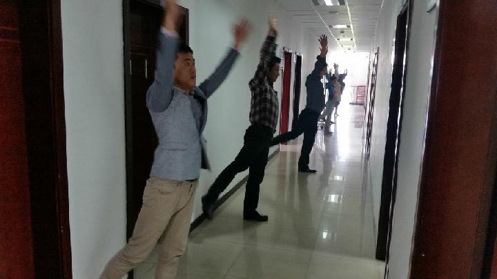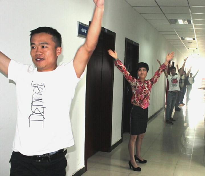 此建議一經(jīng)通報(bào)全院老師,受到大家的一致歡迎。每天上午9點(diǎn)40分左右,學(xué)院領(lǐng)導(dǎo)、院辦公室、各教研室及實(shí)驗(yàn)室的老師們都紛紛走出辦公場(chǎng)所,一齊匯聚到辦公大樓的走廊上,一字排開,伴著節(jié)奏每一位老師都認(rèn)真地規(guī)范地做好每一個(gè)動(dòng)作,課間剛剛下課的學(xué)生們見到此景都情不自禁地駐足觀看,有的加油稱贊,有的拍手叫好,有的拿起手機(jī)給老師們拍上一段視頻。老師們身體力行給同學(xué)們?cè)阱憻捝眢w上做了一個(gè)好榜樣。