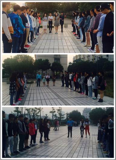 6點20分,在2014級輔導員老師孫曉光的統一組織下,新生們有出現在晨練場上按班級站成方隊。