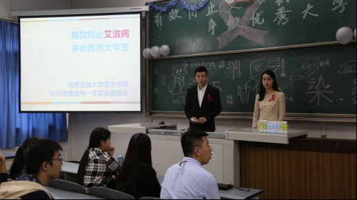 在中國的西南地區是艾滋病的高發區,西南石油大學處于西南地區,此次團會可以幫助同學更好的了解艾滋病,預防艾滋病。團會開始前主持人向每位來參與的同學下發了紅絲帶,并介紹了紅絲帶的意義。現場也是用有著紅絲帶標志符號的氣球和相關宣傳海報布置,十分用心。主持人向大家詢問對艾滋病的看法,同學們積極參加,現場氣氛活躍。隨后,觀看愛心大使彭麗媛女士看望艾滋病孩子的視頻,在視頻中,許多年幼的孩子訴說著他們的希望,訴說著他們的理想,現場有不少同學悲傷落淚。主持人動情的向大家說明艾滋病在平常行為中并不會傳染,例如擁抱、握手,所以不要歧視艾滋病人,因為有些人是無辜感染的,要給他們溫暖和鼓勵。團會最后,主持人播放歌曲《感恩的心》,全體同學起立合唱。
