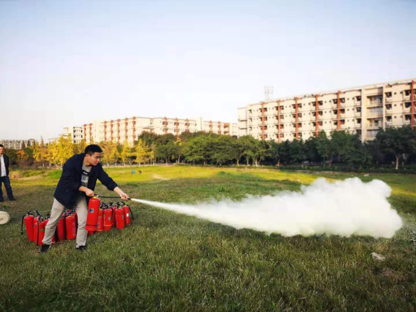 培訓第三環節是模擬火災事故現場,由保衛處老師指導師生實際上手操作滅火器對火災進行撲救,使師生在實踐中學習并掌握滅火器的正確使用方法。