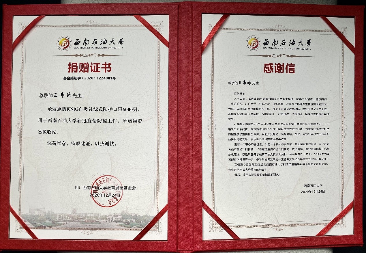 張繼紅對(duì)王韋皓老師的捐贈(zèng)行為給予了高度贊賞并表示衷心感謝。在當(dāng)前學(xué)校上下齊心協(xié)力抗疫的情況下,王韋皓老師自己出資購(gòu)買6000只KN95防護(hù)口罩捐贈(zèng)給學(xué)校疫情防控辦,體現(xiàn)出西南石油大學(xué)一位普通老師的責(zé)任擔(dān)當(dāng)與愛校暖意。
