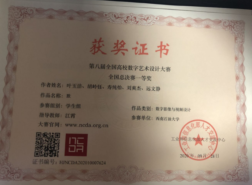 本次比賽共有1106所高校參賽,共征集作品60113幅,經(jīng)由華北賽區(qū)、西北賽區(qū)、華東賽區(qū)等8個賽區(qū)進行評選。經(jīng)過評選,我院江霄老師指導的學生作品《默》獲得了一等獎,我校榮獲優(yōu)秀組織獎,江霄、焦道利、徐萌、岳堂、范超輝等老師獲得優(yōu)秀指導教師獎。