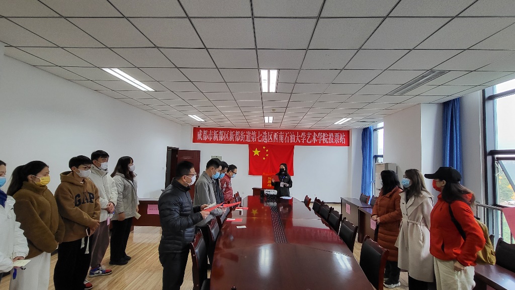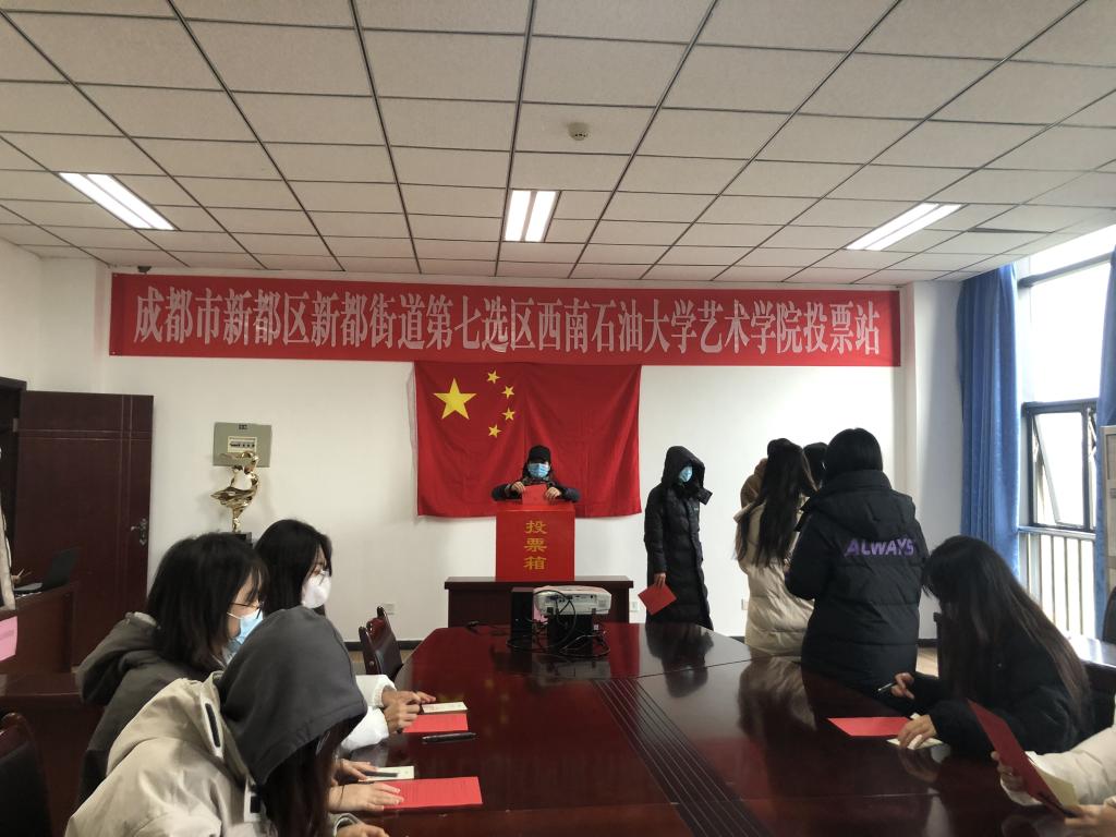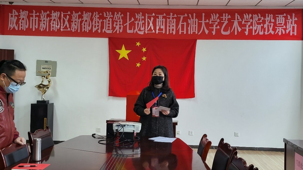 2021年11月18日為新都區(qū)人大代表換屆選舉的正式投票日。學(xué)院設(shè)立了成都市新都區(qū)新都街道第七選區(qū)西南石油大學(xué)藝術(shù)學(xué)院投票站,投票站總?cè)藬?shù)760人,其中教師43人,學(xué)生717人,地址設(shè)在藝術(shù)大樓306會(huì)議室。全場(chǎng)投票站工作的主持人為學(xué)院黨總支書記夏艷,總監(jiān)票人為學(xué)院黨總支副書記何姍,監(jiān)票人為學(xué)院辦公室主任王隆,計(jì)票人為應(yīng)夢(mèng)倩、曹大偉,各班級(jí)的組織者為各年級(jí)輔導(dǎo)員。