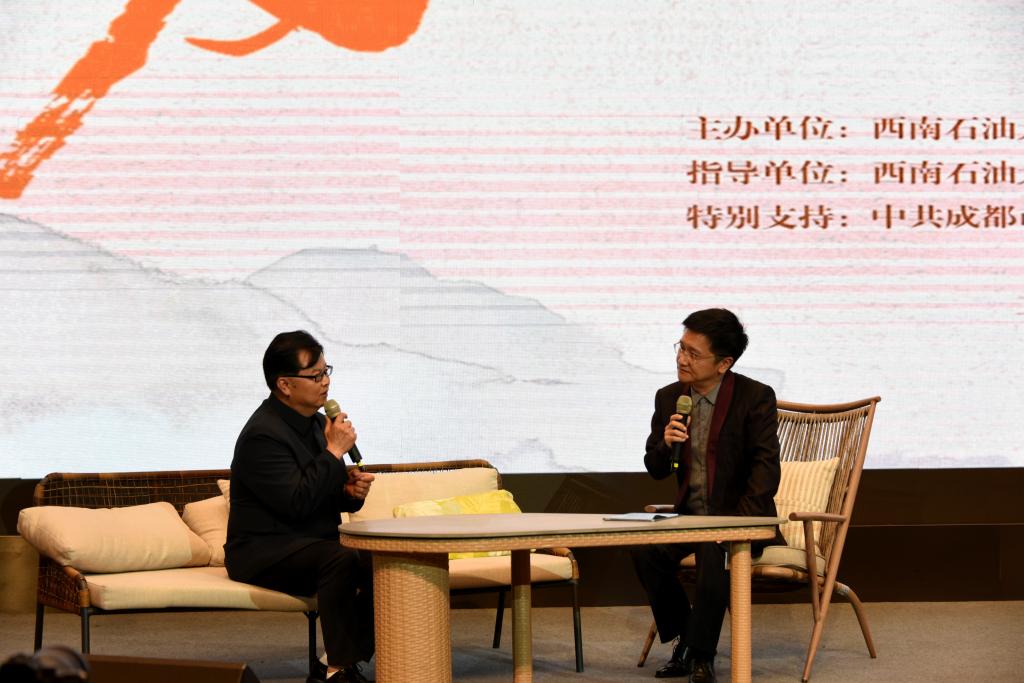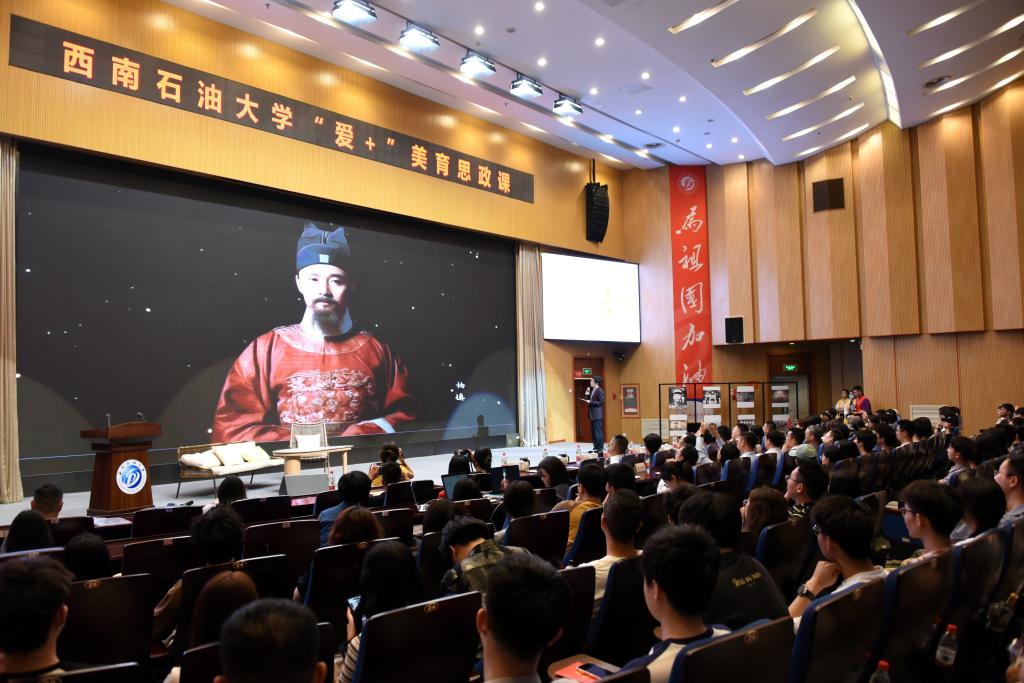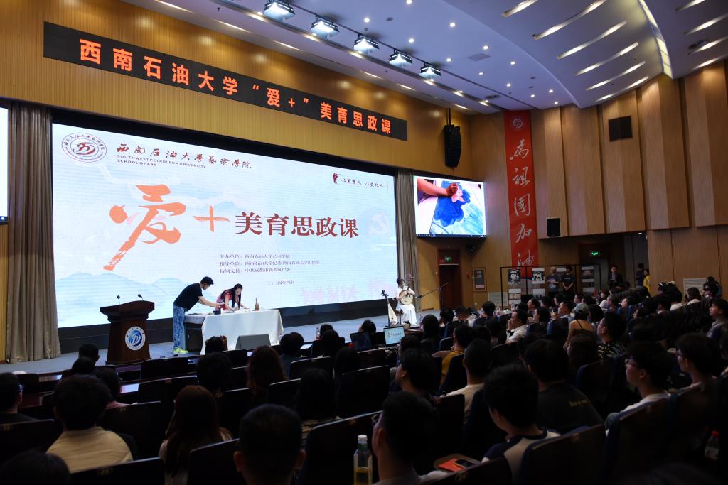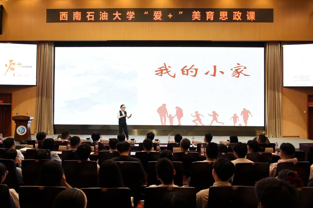 天府家風館講解員、藝術學院2019級校友周瑞講述了何秉彝、盧德銘等愛國仁人志士的家風故事,播音專業教研室黨支部書記王煒與AI生成的楊慎(升庵)先生“超時空”對話,楊慎(升庵)第14代傳人楊德力現場講述楊氏家風家訓,播音專業教師關航通過脫口秀的方式分享自己的小家,編導表演專業教師湯潤達攜女兒湯芷晴同臺獻舞《守護》反映石油工人的家庭故事,編導表演專業王璇現場作畫《蓮》向學校獻禮,楊閻蕓輝通過琵琶和阮兩款傳統樂器彈奏《唱支山歌給黨聽》《如愿》。說、唱、彈、跳、畫,一個個精彩的視聽節目令現場師生沉浸其中,“家國天下”的課程主題不經意間深入人心。