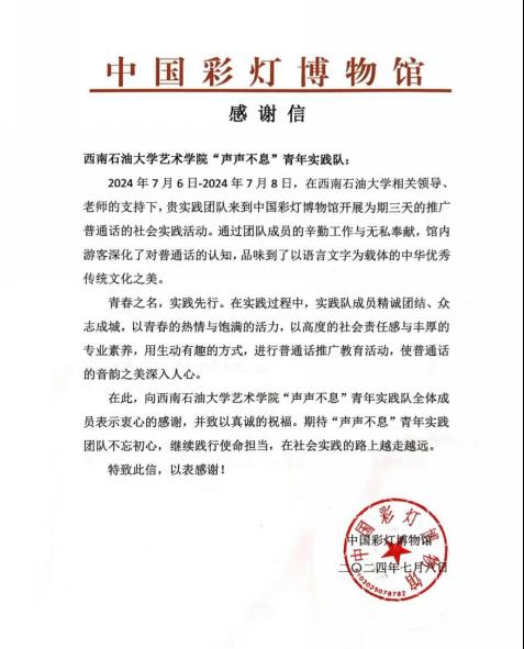 晉韻青芒展風采,聲聲不息傳佳音。“聲聲不息”青年實踐隊奔赴四川多地,開展推普實踐。他們走進社區、公園、博物館等地,將紅色文化的精神內涵融入普通話教學中,根據不同受眾的思想特點進行精準的推普宣講。團隊先后收到了來自中國彩燈博物館、自貢彩燈公園、廣元市利州生態環境局等地的表揚信,推普活動進一步激發受眾學習國家通用語言文字和自覺傳承中華優秀傳統文化的熱情。在山西太原市青年宮,晉韻青芒實踐隊不僅傳授了標準的普通話發音技巧,還通過互動體驗的方式讓參與者感受到語言文化的魅力所在。他們通過走訪調研當地普通話普及情況,制定了一系列切實可行的推普方案,一封封表揚信是對團隊推普質效的最好褒獎。
