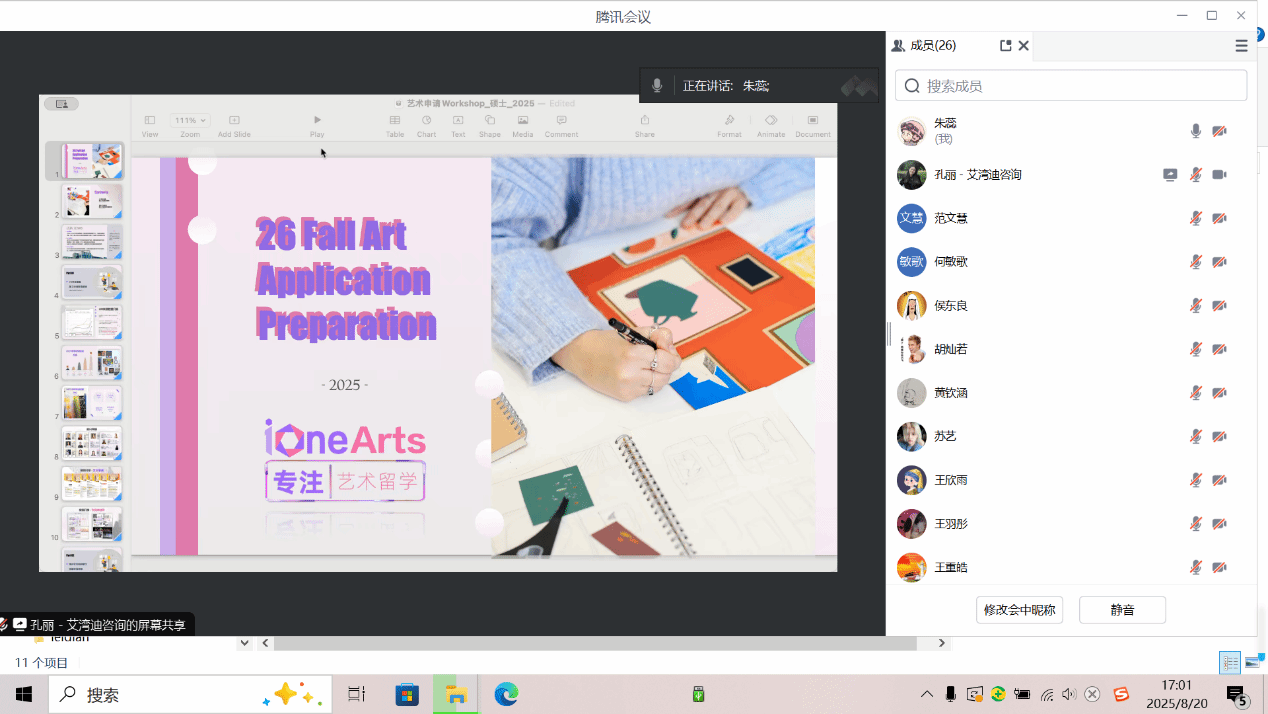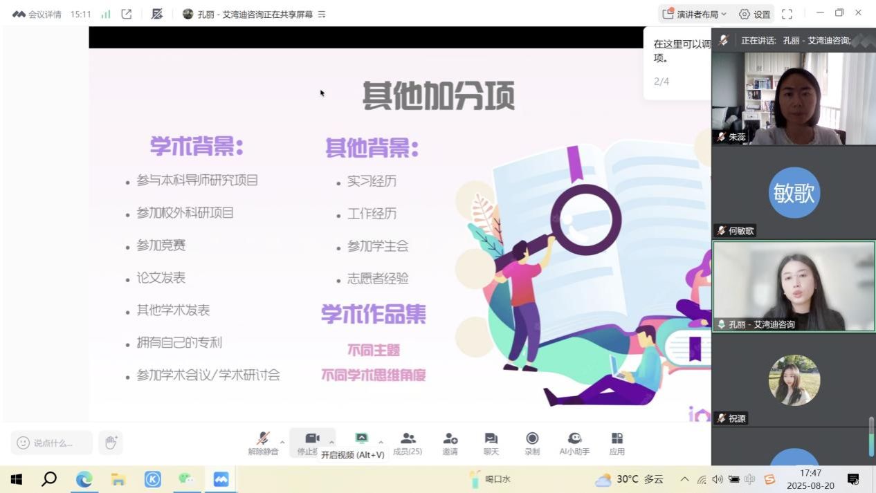 為助力懷揣留學夢想的學子明確申請方向、提升備考效率,8月20日,藝術學院面向部分2026屆畢業生召開了“筑夢遠航:留學備考經驗指導會”。本次會議由朱蕊老師主持,來自愛灣迪咨詢的孔麗老師、雅思備考達人祝源學姐擔任分享嘉賓,共同為同學們的留學之路“充電賦能”。