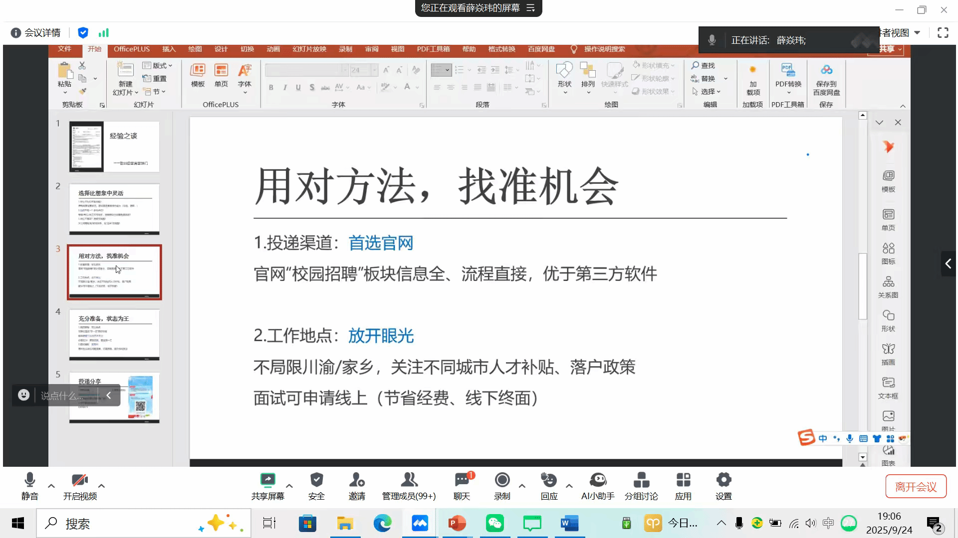 為幫助2026屆畢業生掌握關鍵求職技能,9月24日19:00,藝術學院在騰訊會議平臺上成功舉辦“從校園到職場:如何贏在起點”求職經驗分享會。在知名企業伊利集團任職的我院2025屆畢業生薛焱瑋受邀擔任主講人,分享其寶貴的求職經驗與職場體會。2026屆畢業生參會,會議由輔導員朱蕊老師主持。