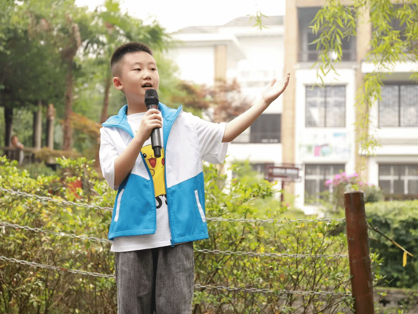 社區活動中心王帆正在進行紅歌誦讀表演