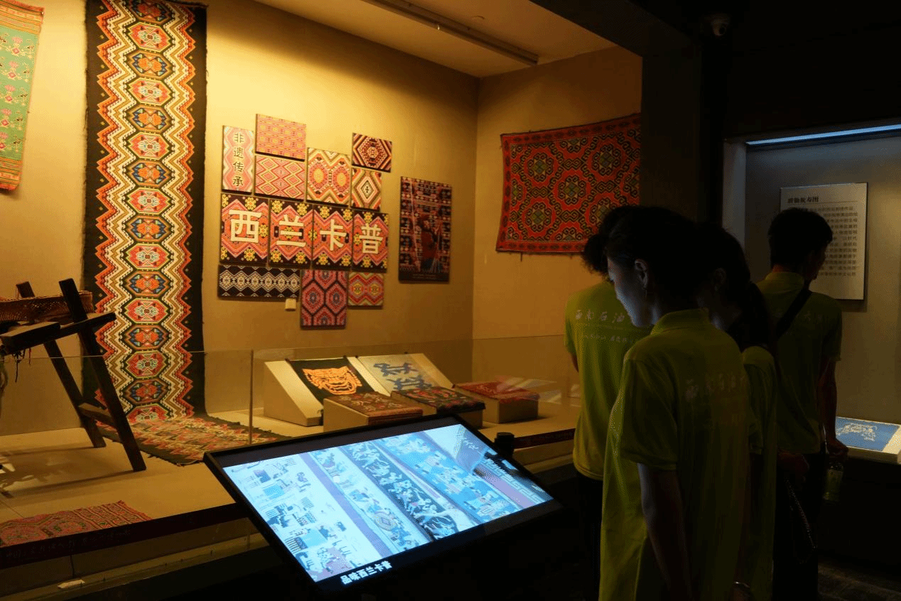 實踐的第一站是恩施州博物館。在這里我們看到了土家族婦女使用的傳統木織機,見到了這種老式織布機的制作全過程,欣賞到了以棉線、絲線為原料編織出色彩絢麗、圖案豐富的織錦。通過講解員的詳細講解,大家了解國家級非物質文化遺產——西蘭卡普(土家織錦)的歷史與發展。在土家語里,“西蘭”是“鋪蓋”的意思,“卡普”是“花”的意思,“西蘭卡普”即土家族人的花鋪蓋。這些花鋪蓋色彩鮮明、熱情奔放,雙鳳朝陽、四鳳抬印、貓腳跡花等豐富造型栩栩如生,一針一線承載著土家姑娘們對生活的熱愛。這些織錦不僅是實用的生活用品,更是承載著土家族文化記憶的藝術瑰寶。