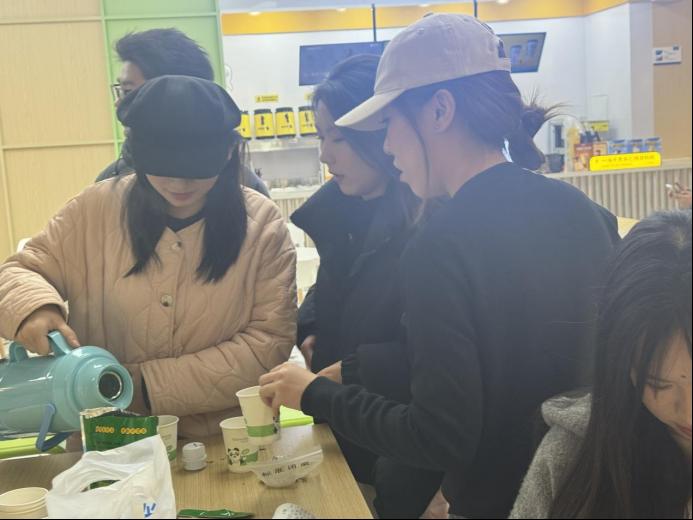 活動現場,同學們分工明確,十人一組,有序完成各項工作。負責燒水的學生來回奔走,將保溫壺灌滿,為后續泡茶做準備。負責挑選茶葉的學生細心甄別,將品質較差的茶葉去除,保障入壺的茶葉品質完好。其余小組負責將泡好的熱茶小心翼翼地裝入杯中。隨著茶香逐漸彌漫,一杯杯熱氣騰騰的茶水被有序地放置在一旁,等待被送往各個工作崗位。隨后,同學們分組行動,將熱茶親手送到每一位工作人員手中,并附上一句句溫馨的感謝語。工作人員們在接過熱茶的那一刻,臉上洋溢著驚喜與感動。