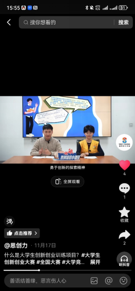 “思創力”雙創教育輔導員工作室結合國家政策,主動適應經濟發展新常態,立足“創新引領創業,創業帶動就業”理念,積極投身于一系列科技主題視頻的創作中。工作室成員們群策群力,為每期視頻精心挑選并策劃了與科技緊密相關的主題,舉辦“思辨飛揚”創新創業街頭采訪活動,在校園內隨機采訪學生,每期視頻制作完成后,都會定期上傳至工作室抖音賬號“思創力”。工作室開展了“創想領航”雙創知識小課堂,以師生同講的方式,圍繞“一個視頻讓你知道什么是中國國際大學生創新大賽?”“什么是大學生創新創業訓練計劃項目”等主題開展專題政策講解與培訓。