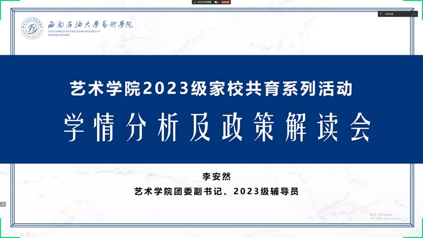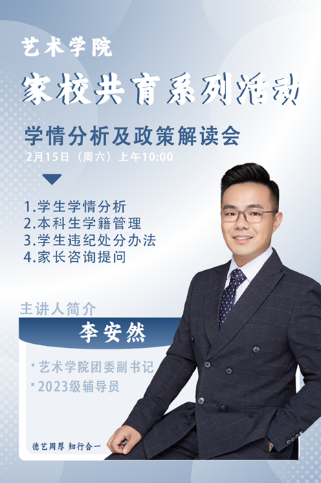 為深化家校協同育人機制,搭建家校溝通橋梁,2月15日10:00,藝術學院團委副書記、2023級輔導員李安然于線上舉辦以“學情分析及政策解讀會”為主題的家校共育活動,藝術學院2023級學生家長參會。